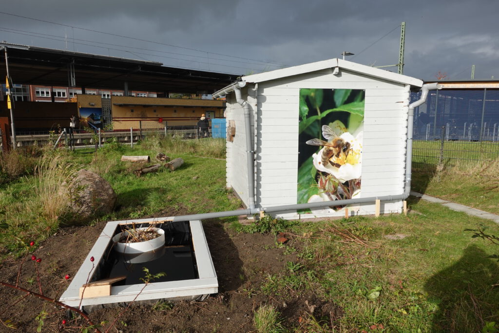 Planungen sind eine Sache, Erfahrungen der auf dem Gelände Arbeitenden eine andere. So haben wir den Ratschlag befolgt, das Gerätehäuschen doch nicht fernab, sondern im Blickfeld der Reisenden vorn zu platzieren.