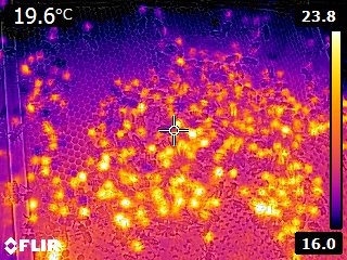 Die Wärmebildkamera hat 4 Bienenkästen in Reihe erfasst. Der helle Bereich zeigt den Aufenthalt des Bienenvolkes in der Beute oben rechts bis mittig. Genaue Temperaturangaben für das Kasteninnere erhält man, wenn man die Kamera auf den Sitz des Volkes richtet.